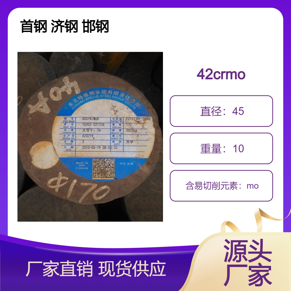 首钢济钢邯钢牌的莱钢42CrMo圆钢优质合金圆棒塑料模具钢42铬钼铬钼钢产品:估价:5120.00,规格:150,产品系列编号:150 发布日期:2025-3-27